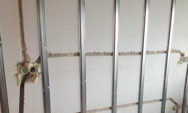 Revestimento de Paredes constituído com Placas Gesso Cartonado apertadas a uma estrutura metálica de maestras ómega fixadas à parede existente. O acabamento de juntas utiliza bandas de papel e armada e massa de acabamento, com barramento geral.