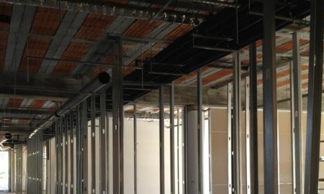 Paredes Divisórias constituída por placas de gesso cartonado fixas por parafusos a cada um dos lados de uma estrutura metálica constituída por raias horizontais e montantes verticais. O acabamento de juntas utiliza bandas de papel e armada e massa de acabamento, com barramento geral.