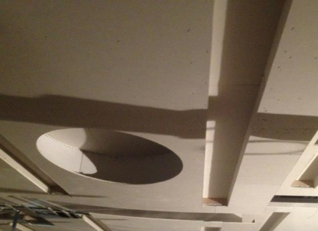 Tecto Falso constituído por Placas de gesso cartonado fixas por parafusos a uma estrutura de suporte de tecto e suspensa ao tecto existente por varão roscado e pivot. Remate à parede liso a fazer ângulo de 90º ou com cantoneira alheta lacada a branco. O acabamento de juntas utiliza bandas de papel e armada e massa de acabamento, com barramento geral.